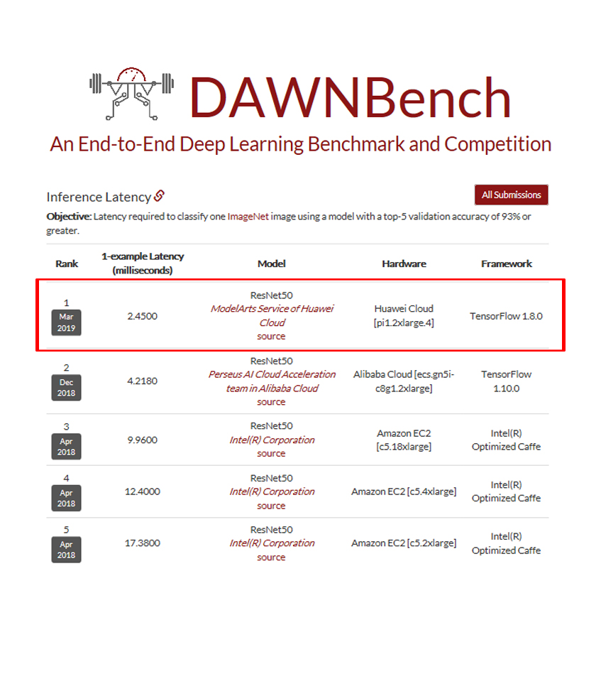 2019 年 3 月份,ModelArts 在 AI 权威竞赛斯坦福大学 DAWNBench 榜单中取得图像识别训练和推理性能双料冠军,将模型训练时间大幅缩减的同时实现了超强推理性能。