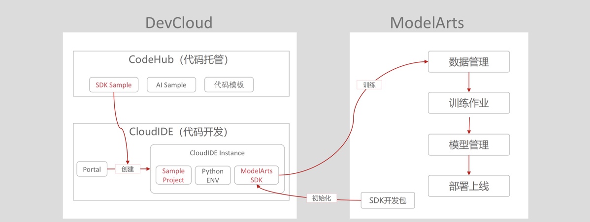 第三,DevCloud 上述两大服务与 AI 开发的全面协同效应。正如上文所言,CloudIDE 具备随时可取云端开发资源的能力,这也意味着,利用 CloudIDE,开发者可以快速搭建 AI 开发环境,而通过 ModelArts SDK的样例模板,可以快速构建自己的项目。