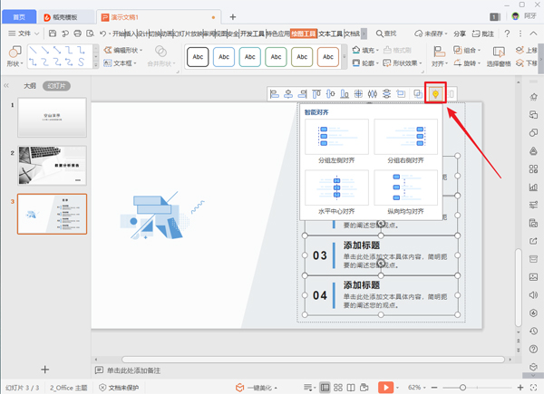 因此,金山办公在WPS Office(Windows版)新增智能对齐功能,仅需2步就能让选中的内容自动对齐,让PPT建立秩序感,变得好看起来。