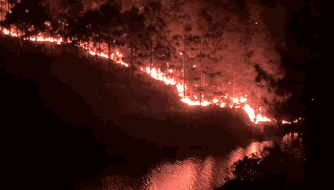 凌云山地区植被以马尾松为主,遇火易燃难灭。针叶林的环境,为树冠火的产生制造了有利条件,在大风的作用下,树林间未燃尽的火花跨越山间水库,飞至一公里外的另一处山林,引发了“飞火”,新的火情愈演愈烈。