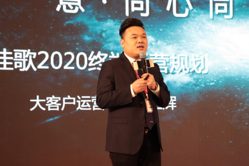 战略新品助力企业迈向云端。在万众期待下,营销总经理黄忠海,技术总监俞杭军和佳歌优秀经销商代表上台为新产品的揭开神秘面纱,相信新品的推出,能为市场注入新鲜的血脉,引进新的力量,助力佳歌经销商共赢2020!