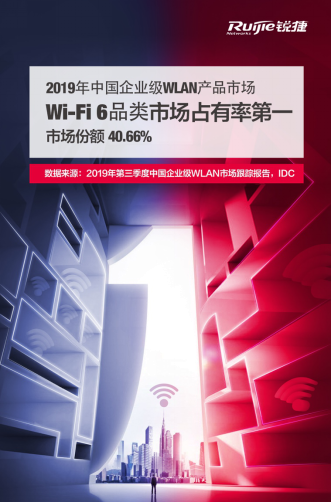 近日,国际知名数据咨询公司IDC发布《2019年第三季度中国企业级WLAN市场跟踪报告》。数据显示,锐捷网络在Wi-Fi 6品类市场占有率排名第一,市场份额达到40.66%。