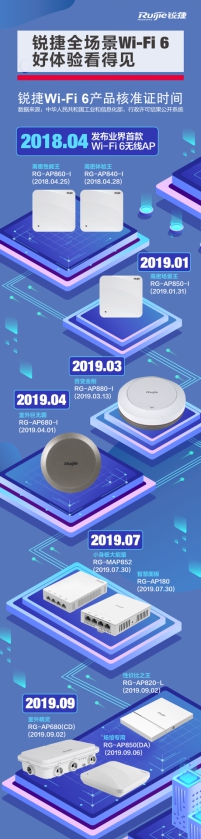 自2018年4月锐捷率先推出业界首款Wi-Fi 6无线AP,到2019年9月发布全场景Wi-Fi 6系列10款产品,再到2019年第三季度获得Wi-Fi 6品类市场份额第一,展示了锐捷在无线领域强大的技术实力和不断精进的场景创新力。