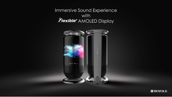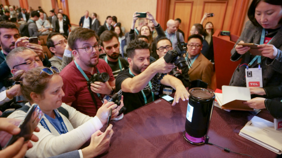 现场媒体对另一款新产品音箱也非常感兴趣。Mirage柔屏智能音箱是柔宇科技与Cleer品牌联合发布的一款“柔性+智能家居”产品,音箱正面约8英寸的柔宇自主研发生产的全柔性显示屏,可以大角度显示文字、图片和视频等信息,为用户提供沉浸式视觉体验;同时搭配前置广角摄像头,用户可进行高清的视频通话。