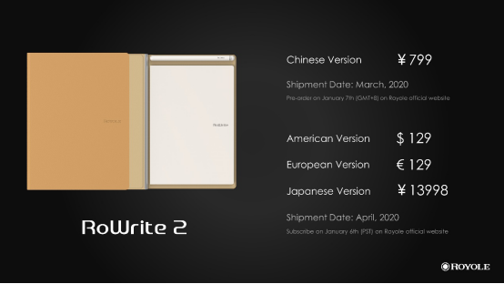 RoWrite 2柔记2中国大陆版用户可交99元在柔宇官网进行预购,3月份开始交付,零售价799元;美国、欧洲、日本官方版本即日起开始在柔宇官网预约,4月份开始交付,零售价分别为129美元、129欧元、13998日元。Mirage柔屏智能音箱将于第二季度在美国及英国销售,售价分别为899美元、799英镑。