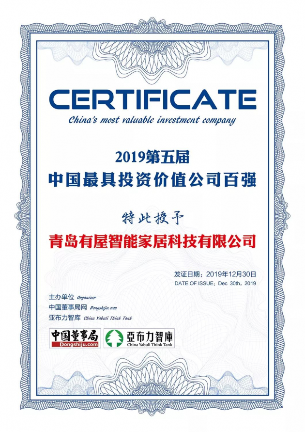 2019年12月31日,由中国董事局网、亚布力智库共同主办“2019第五届中国最具投资价值公司百强榜”隆重发布,青岛有屋智能家居科技有限公司(以下简称“有屋科技”)入选,位列榜单第39位。