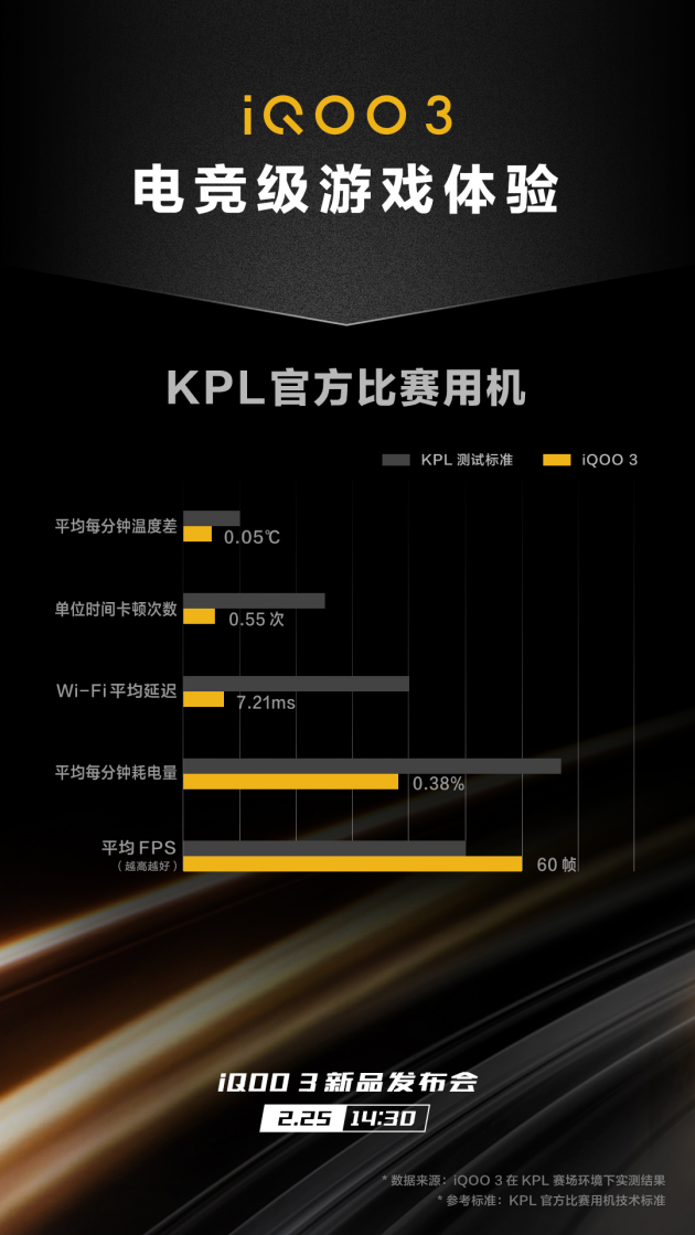 具体表现上,iQOO 3在运行王者荣耀时,平均每分钟温度波动仅为0.05℃,Wi-Fi平均延迟 仅为7.21ms,平均每分钟耗电量仅0.38%,平均FPS高达60帧,而在卡顿次数的表现上,iQOO 3在单位时间内卡顿次数仅有0.55次。这些,都远超KPL官网测试标准,也是iQOO 3成为KPL能成为官方比赛用机的重要条件。