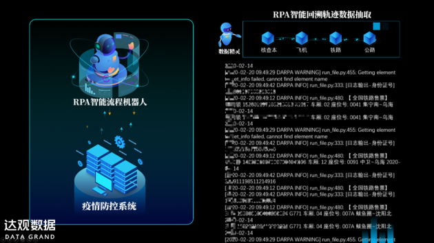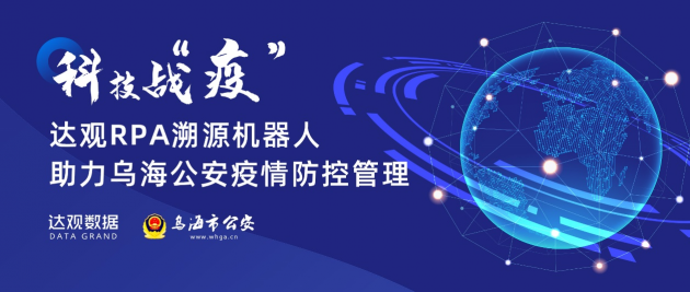 在当下复工阶段,相关公共部门对复工人员的信息采集工作尤为重要。近日达观数据联合乌海市公安局,通过引入RPA机器人,在疫情防控监测点对通行人员的轨迹进行溯源识别,帮助防控指挥部对复工人员的流动信息进行自动化采集、识别与判断,为疫情防控和维护社会稳定提供保障。