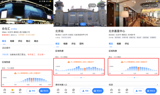 目前这一功能已在北京、上海、广州、深圳四座城市上线,覆盖写字楼、购物中心、火车站、飞机场等人员密集的公共场所。当用户搜索这类场所时,在地点详情页即可查看当天各个时间段的人流量数据。区域热度以柱状图形式展现,便于用户直观了解不同时段的人流变化。以3月13日上午9时左右的实时数据为例,分别搜索北京合生汇购物中心、北京站、嘉里中心写字楼等地点后可以看到,该地人流量与上周峰值相比分别为“较小”或“适中”较为适合出行。