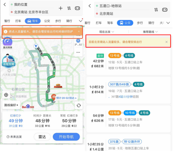 更为重要的是,当用户使用百度地图驾车导航和查询公交出行路线时,百度地图还会根据当前时间和到达目的地时间的人流量进行综合判断,若目的地人流量较大,页面中将跳出黄条提示,提醒用户合理安排出行时间、出行做好防护措施。百度地图的ETA功能(通行时间智能预估)在实现对通行时间精准预估的基础上,还结合人流量数据进一步守护着出行安全。
