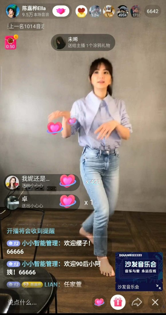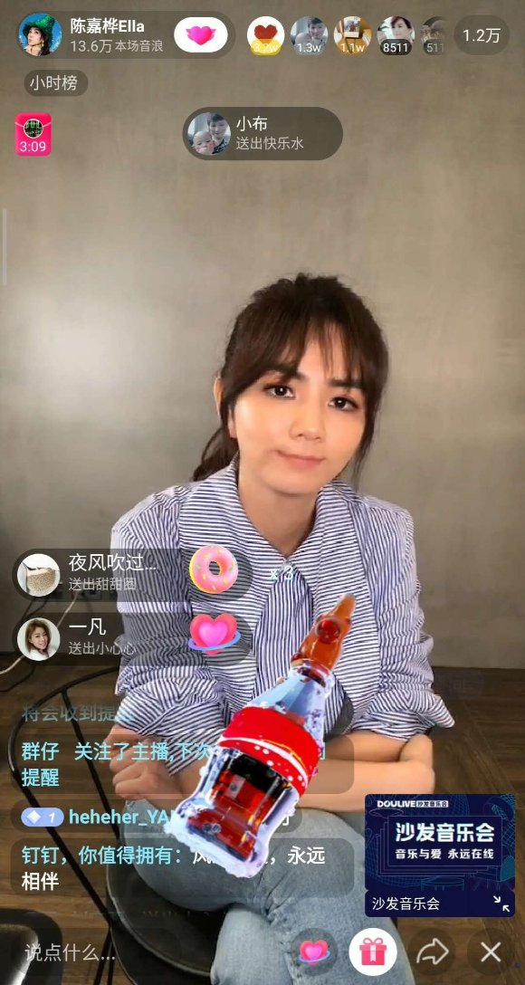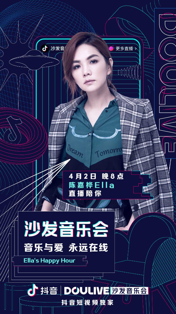 据悉,作为抖音娱乐直播厂牌DOULive的王牌专场之一,“DOULive沙发音乐会”以“音乐与爱,永远在线”为初衷,邀请国内知名音乐厂牌、音乐人、明星歌手现身抖音直播间,在日常居家的环境中在线开播,用音乐为用户带来温暖、感动的美好体验,陪伴用户一同度过美好时光。截至目前,活动已累计举办直播超56场,40余名艺人参与其中。除陈嘉桦(Ella)外,G.E.M.邓紫棋、刘宪华Henry等知名音乐人也在过去的20多天里纷纷现身直播间,陪用户度过了一个又一个温馨的夜晚。