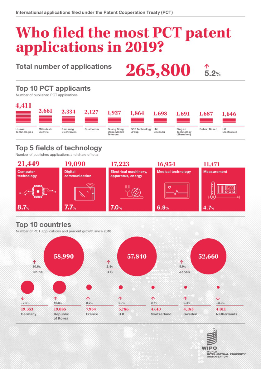 根据公开的数据,2019年,中国通过世界知识产权组织《专利合作条约》(PCT)途径提交了5.899万件专利申请,成为提交国际专利申请量最多的国家。在排名的前十企业申请人中还包括华为、广东欧珀、京东方科技其他三家中国企业。