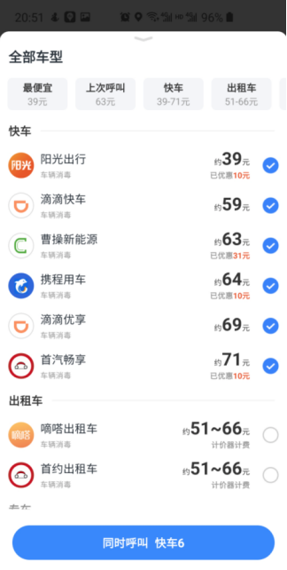 目前,百度地图已聚合滴滴、首汽、曹操、嘀嗒、携程等全网优质打车品牌,包含20余种车型,并涵盖出租车、快车、专车、接送机、租车等主流用车服务,用户一键即可对比全网品牌、车型及价格,无需来回切换APP就能快速叫车出行。尤其在疫情期间,百度地图还联合所有接入的网约车品牌,保障旗下运营车辆每日消毒,司机均佩戴口罩上岗,让用户都能够安心坐上消毒车辆。