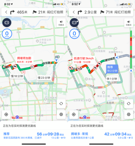 熟路模式下,百度地图还为用户定制了专属拥堵播报能力。一方面,开车时不习惯盯着导航看的人,可以通过语音播报安全、高效的获取信息。当路况和耗时较往常发生变化时,导航将及时播报,让用户对变动心中有数;当行驶到分岔路口时,导航也将播报分岔路口每条路线的路况、用时对比,同时给出推荐路线,如同“智能副驾”为用户省时。