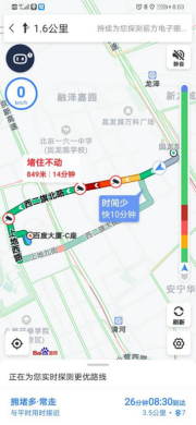 另一方面,不想被语音打扰的人可以选择静音模式,百度地图将在路线上清晰标注出拥堵程度:如拥堵车速、拥堵耗时对比、拥堵变化趋势等等,并给出推荐路线的气泡提示,扫一眼便知该如何走。