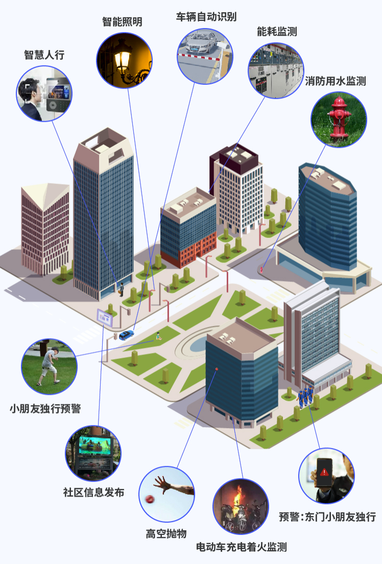 全场景包括智慧门禁、智慧停车、视频监控、消防用水监测、用电监测、智能照明、安全防范和智能家居等场景。
