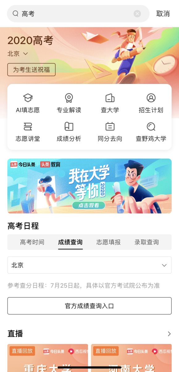 7月24日放榜之际,今日头条再次联合百所高校进行更加全面的招生直播,指导考生和家长填报志愿,为他们提供科学的指导和专业的建议。高考期间,打开今日头条,搜索“高考”,是3000万考生和家长留下的痕迹。