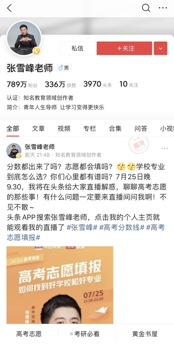 作为头条教育领域知名创作者,张雪峰老师在头条拥有789万粉丝,创作近4000篇内容,收获336万点赞,成为不少学子的指路明灯。高考期间,他在今日头条通过直播分享自己在志愿填报、专业选择上的建议,与他的粉丝亲密互动。