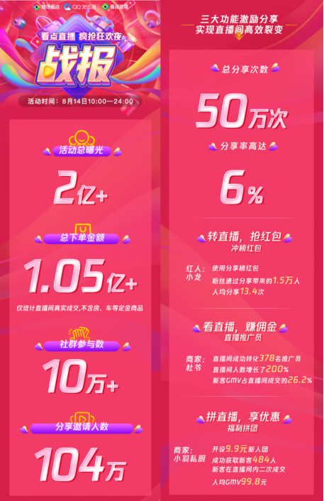 8月14日,“看点直播疯抢狂欢夜”暨首届红人巅峰赛活动收官,68位直播带货红人携百款精选好物为用户带来优惠福利。活动通过福利拼团、直播推广员和冲榜红包三大新功能实现高效社交裂变,直播间观众主动分享50万次,卷动10万+社群,总下单金额超1.05亿元。