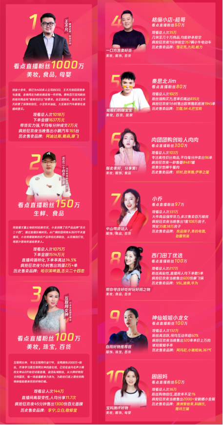 同时,腾讯看点直播选拔的首批红人也角逐出“红人主播TOP10”,他们的下单金额占“看点直播疯抢狂欢夜”总下单金额的57%,主播“王不凡”、“舌尖二十四恋-小龙”分别以1637万元和1514万元下单金额获得冠亚军,“互联网女神”斩获季军。腾讯看点直播表示,后续将全力打造首批红人,为红人一对一制定全年的合作计划。