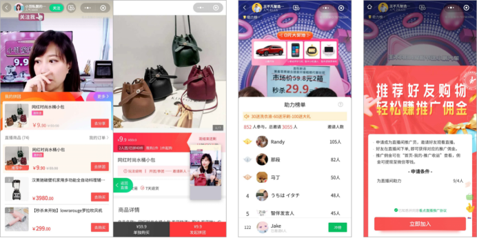 “福利拼团”支持商家设置低价福利商品以吸引新老顾客邀请更多好友拼团抢购;“直播推广员”功能支持用户成为某电商直播间的直播推广员,推荐好友进入该直播间并下单,直播推广员即可获得红包奖励;“助力榜冲榜红包”则是结合助力榜和红包功能推出的全新玩法,商家通过为助力榜上指定排名设置冲榜红包,进一步激励粉丝为商家拉新引流。