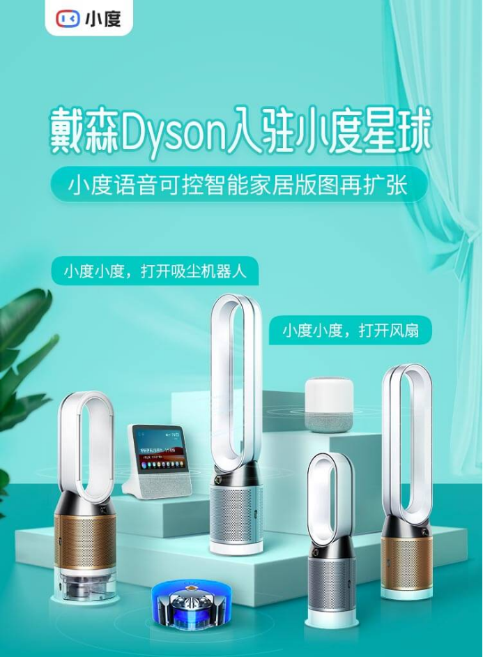 据了解,拥有小度旗下智能音箱或智能屏系列产品的用户,可以通过Dyson Link小程序添加可连接设备,并在“小度”APP上完成戴森账号与百度账号的绑定,即可以通过“小度智能语音-Dyson戴森智能技能”来对戴森旗下空气净化风扇、无叶风扇、除菌加湿器及智能吸尘机器人等可联网产品下达指令,通过呼唤“小度小度”实现远程启动、设备信息状态查询、询问室内空气质量等操作。