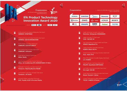 中国全球化消费电子品牌继续保持了旺盛的生命力与创造力,其中Midea凭借智能化的新厨房Ifamily系统和空调KFR-35GW/BP3DN8Y-XT100(1) 分别摘得“智慧厨房解决方案金奖”和“用户体验创新产品金奖”;HONOR凭借MagicBook Pro和Watch GS Pro夺得“高性能创新型笔记本金奖”和“户外创新穿戴设备金奖”;BOE Flexible OLED Full-screen Display 获得“创新显示技术金奖”; 长虹CHiQ 75Q7ART 8K获得“设计创新电视金奖”;TECNO凭借CAMON 16 Premier夺得“智能手机拍照技术创新金奖”。