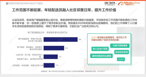 2020年初,第一财经商业数据中心CBNData联合阿里巴巴集团发布《阿里巴巴数字经济体90后生产力报告》显示,主要由年轻人构成的外卖配送员群体已成为城市经济活力的重要风景。他们中近三成将外卖配送作为从老家来到城市的第一份工作,并且通过积极融入社群邻里日常收获工作价值。