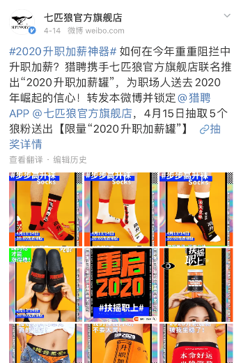 实际上,这并不是七匹狼电商第一次尝试破圈的社会化营销玩法。此前,七匹狼电商曾联合猎聘推出的“2020升职加薪神器”,精准切中职场人对于升职加薪的心理诉求;在520和七夕这两大情人节,分别与七度空间和中国邮政合作,推出限定情侣装;此外,还与老字号品牌宝芝林推出国风味十足的“啸江湖”系列,与中国青年报联合推出五四专款强国青年T恤等。