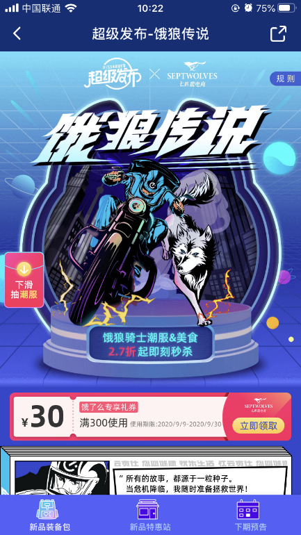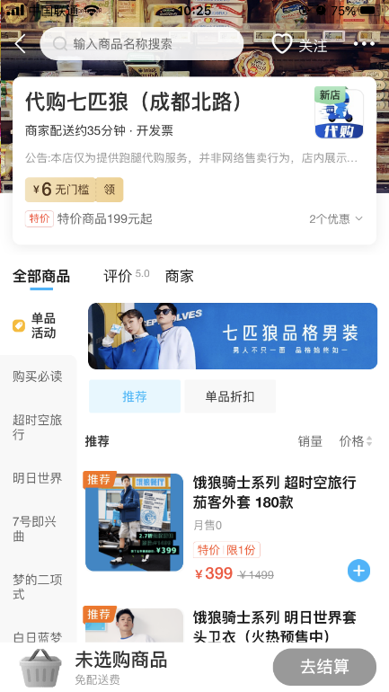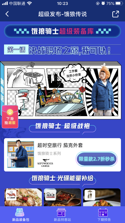 其次是消费场景的多端联动,为消费者开创了新零售时代的全新体验。国民男装入驻外卖平台,开设跑腿店铺,使用户能够通过“点外卖”的方式最快速地买到同款。饿了么在站内上线「饿狼传说」主题会场, 推出“饿狼骑士装备库”, 将食物与潮服连接起来,则为用户构建了一个更复合多维的消费场景。会场还联动了七匹狼和饿了么的天猫官方旗舰店,优化消费体验的同时,实现了双端互动。