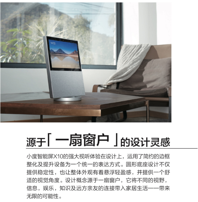 据fuseproject介绍,小度智能屏X10的设计概念源于一扇窗户,它将不同的视野、信息、娱乐、知识及远方亲友的连接带入家居生活,带来无限的可能性。在这样设计理念下,小度智能屏X10也为用户的居家时光,带来了无限的可能性。