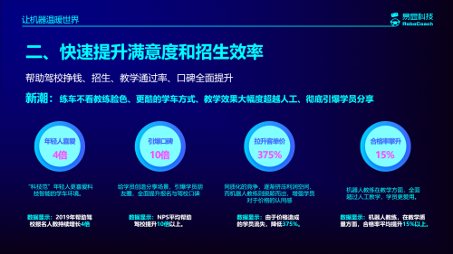 机器人教练在产品设计上着力从两个根本点上助力驾校经营升级,首先是大幅降低驾校运营成本,据合作驾校数据表明,机器人教练较传统人工教学可节约人工成本75.96%,并降低驾校维修成本、福利开支及管理成本。其次,机器人教练可快速提升驾校口碑及学员满意度,从而提升招生效率。据统计数据表明,机器人教练驾校在教学质量上平均提升15%,平均提升招生人数32%,品牌口碑提升10倍以上。其带给驾校及学员的价值感全面超越传统教练。