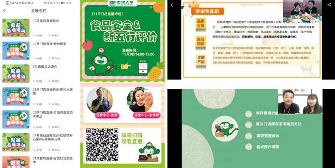 更值得一提的是直播的应用——百果园的商品力项目,依托知鸟直播,开展全员果品知识的宣导学习;百果园每月组织的全员分享大会,对于在岗加盟门店店员采用知鸟直播的方式进行会议重要内容的宣导,通过直播间的提问互动,实时了解和解决学员的问题。