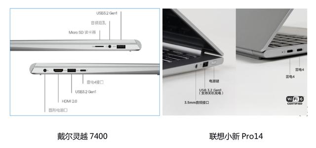 戴尔灵越7400通过了英特尔Evo平台严苛认证,接口更丰富,拓展便携性更好:轻薄机身却标配了双USB3.2接口、雷电4接口、HDMI接口、标配电源圆孔接口、Mic SD读卡器和3.5mm音频插孔;对比之下,联想小新Pro14只有标配USB3.2接口、双雷电4接口和3.5mm音频插孔,在接口上严重影响到日常使用,还需要用户额外购买转接器进行拓展。