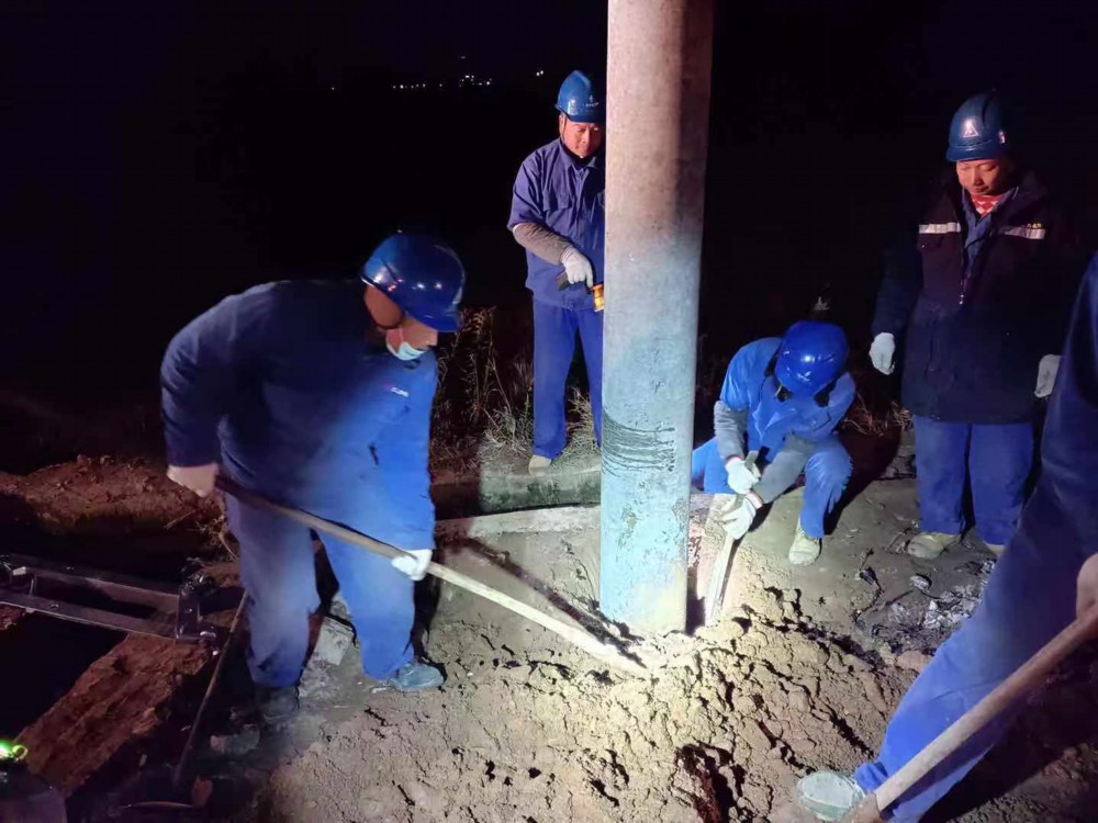 但抢修队伍抓紧一分一秒,拔掉断杆、重挖杆洞、立杆、拉线等各项工作有条不紊的进行着。寒夜很冷、冰冷的杆塔更冷,但现场抢修人员无不怀着一颗马上恢复供电的火热之心。