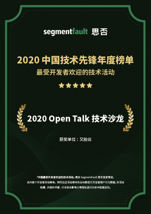 本次入选 2020 中国最受开发者欢迎的技术活动榜单,是广大开发者对又拍云 Open Talk 的认可,又拍云将继续举办更好的技术活动,创新活动形式,分享更多优质技术干货。