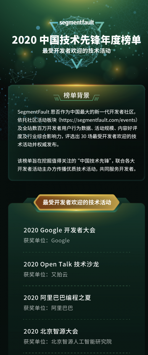 SegmentFault 思否作为中国领先的新一代开发者社区,依托社区活动板块及全站数百万开发者用户行为数据,及活动规模、内容好评度、行业综合影响力指标,评选出 30 场最受开发者欢迎的技术活动并权威发布。