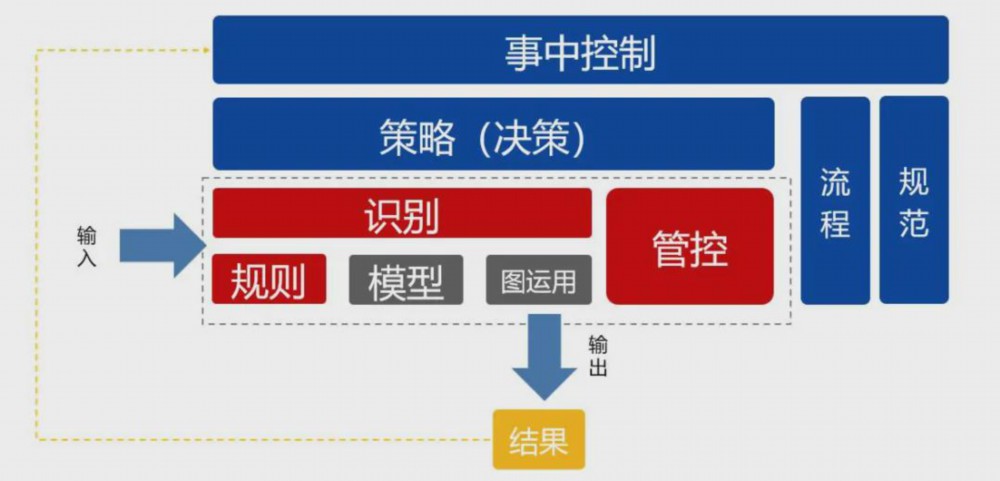 事中的工作主要是布置风险策略,策略有两块组成,一部分为识别,一部分为管控(处置)。识别的方式可以是规则、模型或是通过图的方式来识别,“识别+管控(处置)方式”构成了一个或一系列完整的策略。而制定、调整策略的过程,则被称作为“决策”。