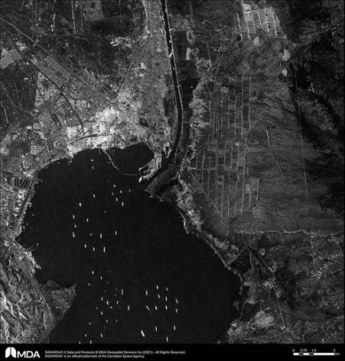 图:2020年3月,长赐号货轮在苏伊士运河搁浅一周,造成超过400艘货轮在运河两端长时间等待。有专家称,这一事件给全球经济造成每日4亿美元的损失。(上卫星图:麦克萨;下卫星图:MDA公司)