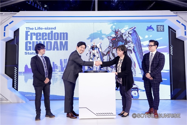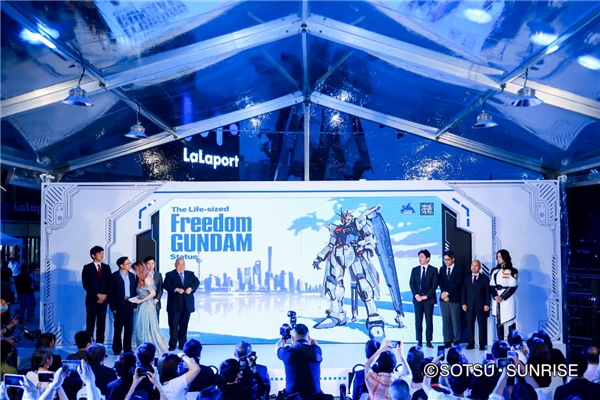 万众期待的揭幕仪式在热血的开场动画后正式开启。冷泉弘隆(万代南梦宫(中国)投资有限公司董事长兼总经理)、山田大辅(万代南梦宫(中国)投资有限公司董事、万代南梦宫(上海)互动娱乐有限公司和日昇(上海)品牌管理有限公司董事兼总经理)及三井不动产和金桥股份的相关领导出席了此次揭幕仪式。同时,品牌方还邀请到中国青年演员,同时也是高达铁粉的尹正做为特别嘉宾,和相关领导一起为立像揭幕。正式揭幕后的实物大自由高达立像,全身多处会发出耀眼光芒,头部和手掌部分也会配合动画及灯光效果做出动作变化,是首座在日本本土以外亮相的高达立像,这也预示着未来,高达将在中国展开更多的市场合作内容,呈现更加丰富多元的娱乐形式。