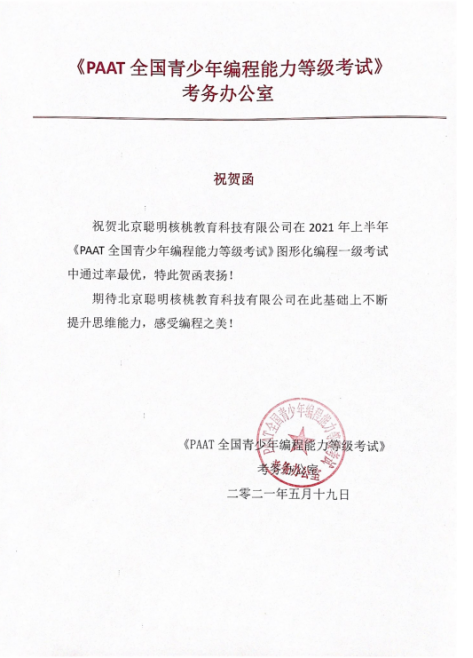 近日,教育部一级学会全国高等学校计算机教育研究会主办的“PAAT全国青少年编程能力等级考试”(简称“PAAT编程等级考试”)2021年上半年考试顺利收官。官方数据显示,核桃编程学员在图形化编程一级考试当中通过率高达96.4%,通过率位列少儿编程行业第一。值得关注的是,核桃编程是唯一一家收到“PAAT全国青少年编程能力等级考试”主办方官方祝贺函的少儿编程机构。