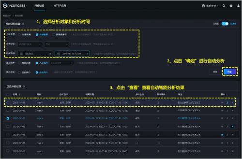 智能分析:基于AI算法及产品内置的故障分析逻辑,实现一键式、或API调用的故障自动化分析。极其简便的使用方式,让IT运维各个部门都能直接使用。 一键式故障分析。产品提供界面及API接口,用户可在导航式界面中,输入所需分析的数据目标及分析时间段,系统即可进行智能化分析并给出分析报告。