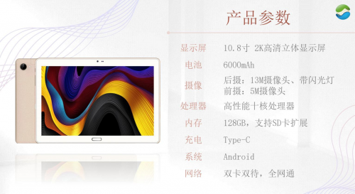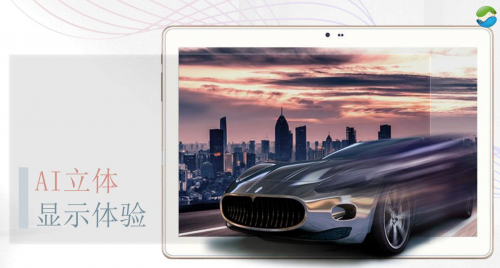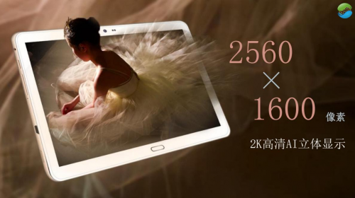机身背面中间带有银色 未来科技高端立体显示平板的标志,前后高清像素摄像头分别为 1300 万*500 万像素。10.8 寸 2560*1600 像素 2K 高清 AI 立体显示屏,崭新 AI 立体显示技术可以让我们在观看时色彩鲜明、画面细致,并且支持 2D/3D。