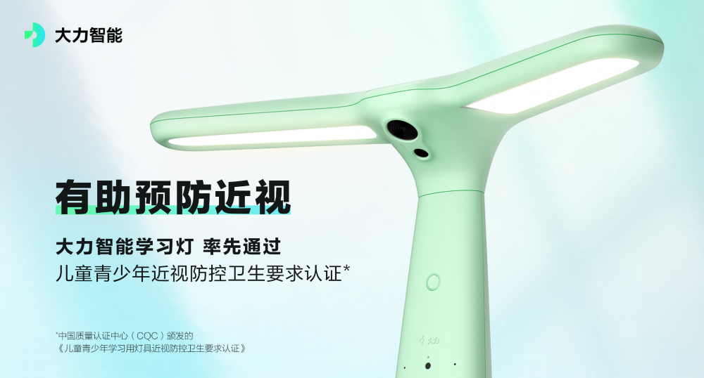 目前,大力智能学习灯已率先获得中国质量认证中心(CQC)颁发的《儿童青少年学习用灯具近视防控卫生要求认证》,在儿童青少年学习用灯具产品领域中率先通过该认证。由此意味着该灯可有助于保护儿童青少年视力健康和防控近视。