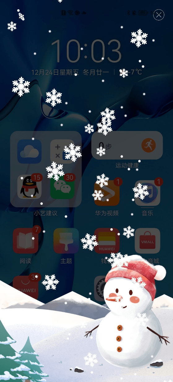 长按电源键1秒唤醒小艺说“小艺,下场雪”,手机就会跳转到下雪场景,大片大片的六角形雪花会缓缓从落在带着圣诞帽的雪人身上,浪漫十足。如果伴侣或爸妈还不知道这个彩蛋,那你给他们的圣诞惊喜又多了一个!
