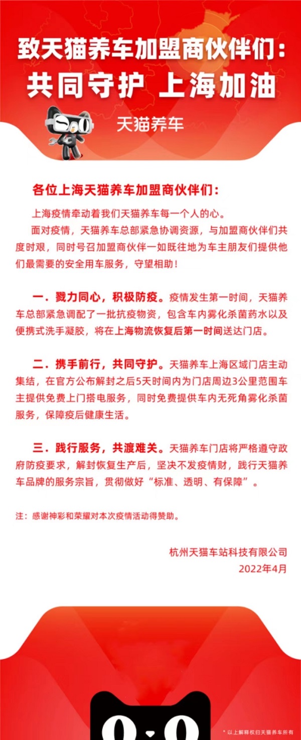 同时,天猫养车也持续关注各地疫情发展动向,针对近期上海等地的疫情形势,特推出了相应疫情防控号召,号召广大加盟商伙伴,戮力同心、积极防疫、共渡难关,与广大车主朋友携手共度时艰!