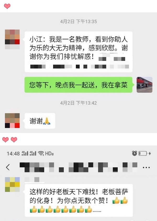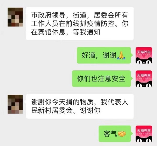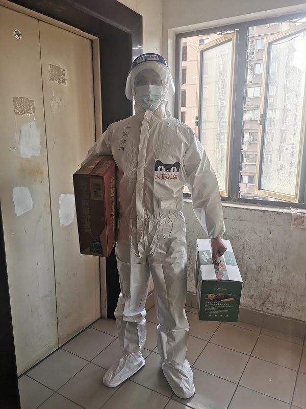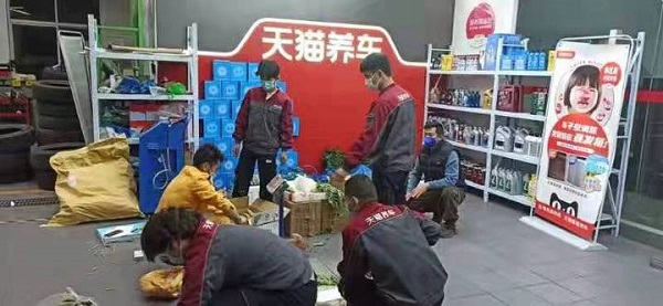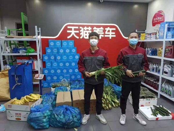 那段时间江店长和店员们,经常每天只能睡2-3个小时,忙起来有时甚至会顾不上吃饭。当被问及是否会觉得辛苦时,江店长告诉我们,“我们就是本着公益心做,不觉得累。有时很晚还能收到顾客的感谢信息,说哪里都买不到菜,天猫养车帮了他们大忙,就会感觉很暖心,什么疲惫都没有了。”
