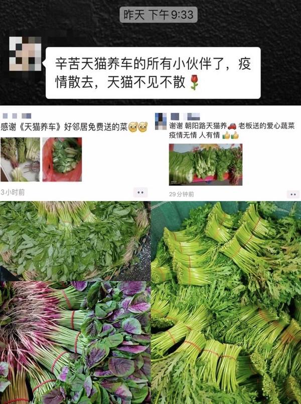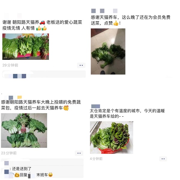 在送菜的路上,华老板不断收到各个小区的求助信息。他们就这样一直干到晚上11点,几乎跑遍了太仓的所有小区,把车上的蔬菜全部送完。“最后一个配送是10点半,我和他说实在不好意思,给你送太晚了。但他马上发了朋友圈,说感谢天猫养车这么晚了还能过来给他送菜,我们真的非常感动。”