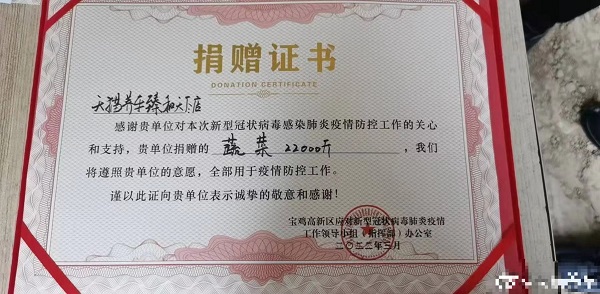 今年3月,陕西省宝鸡市突发疫情,天猫养车臻和天下店自发捐赠2.2万斤蔬菜,为保证市民蔬菜正常供应献出自己的一份力量。