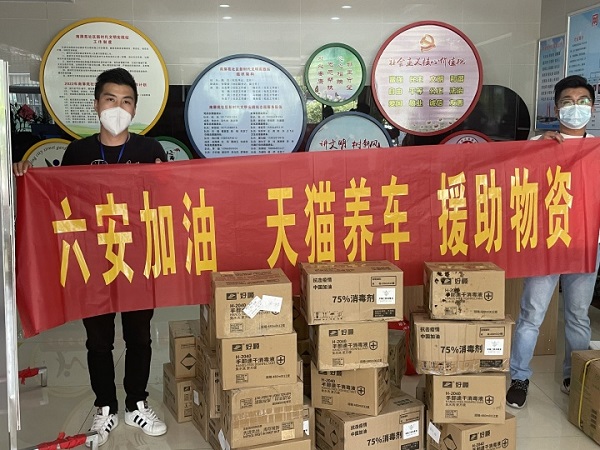 4月4日,安徽省六安市突发疫情,天猫养车和谐名城店负责人陈老板主动拿出店内医用物资共380多瓶消毒用品,捐给所在南屏苑社区居委会,其中包括75°消毒液60瓶、免洗消毒凝胶200余瓶、75°消毒喷雾120瓶等。